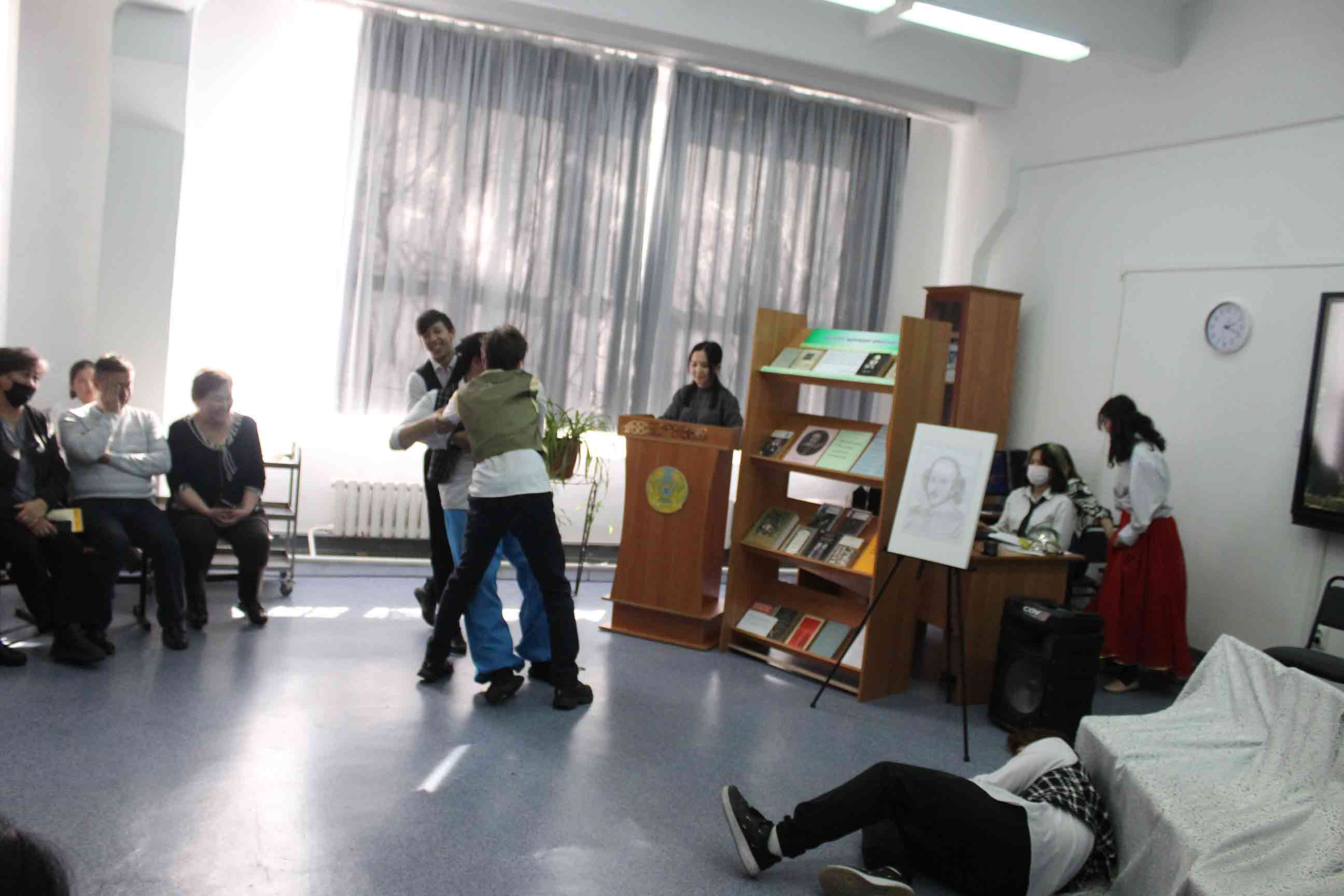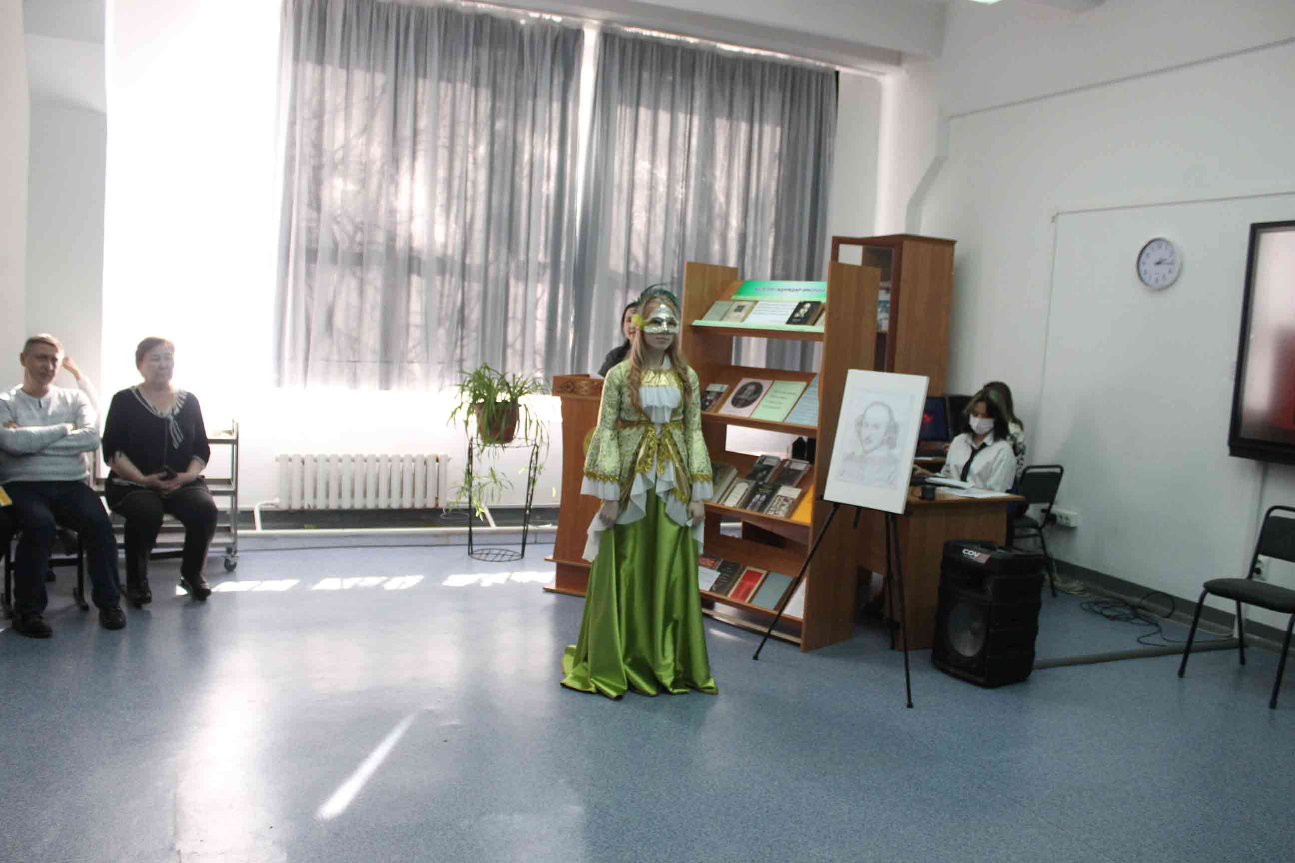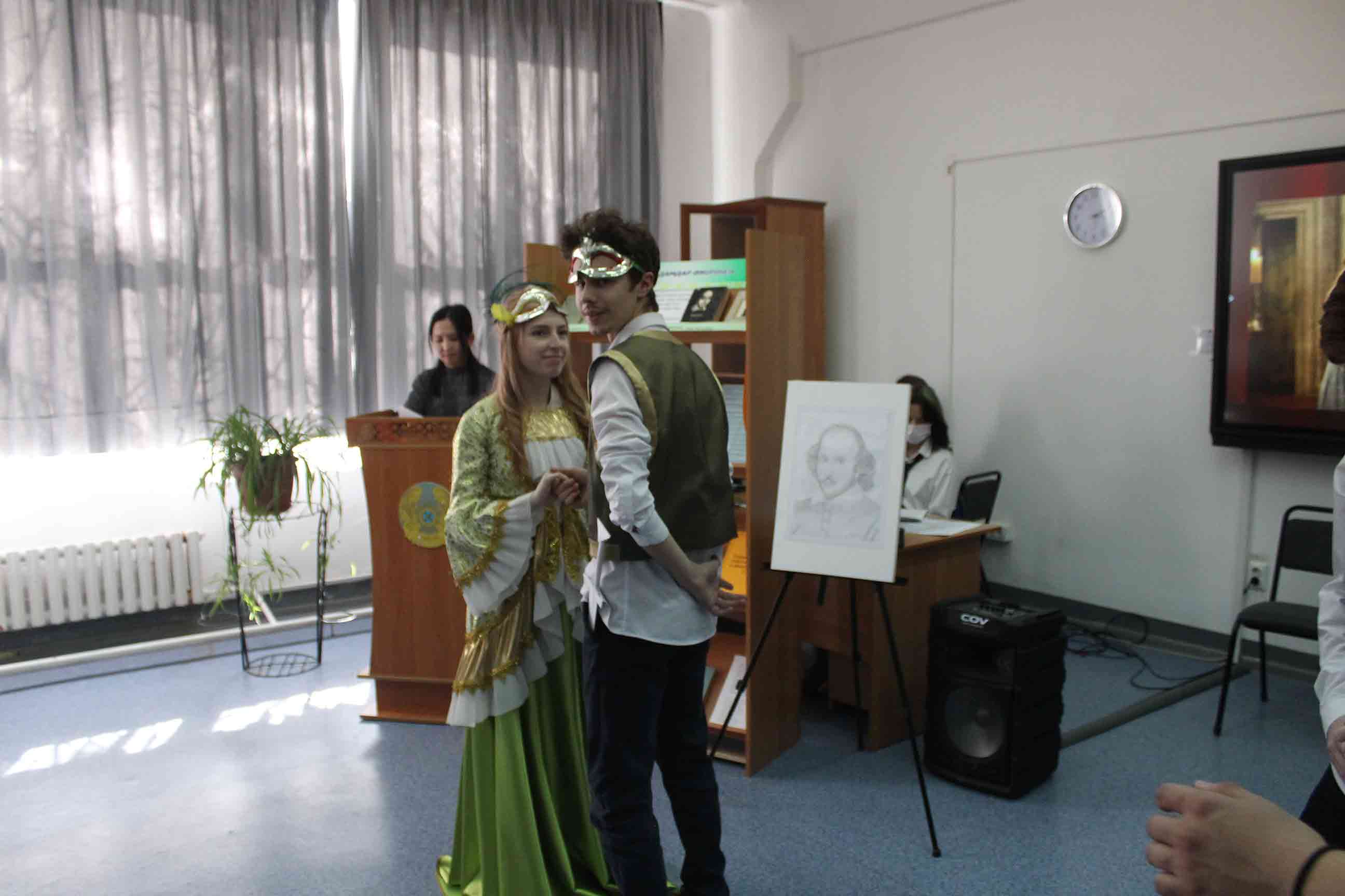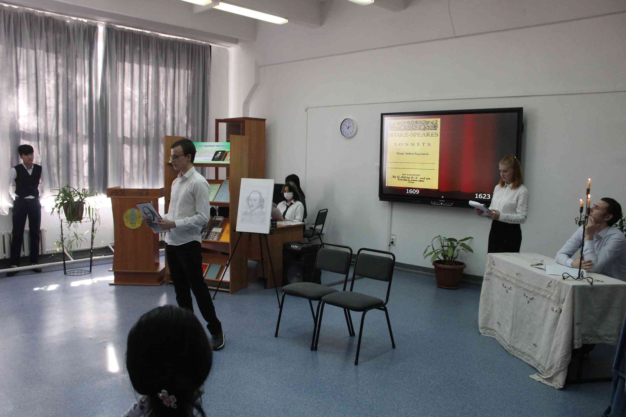 25.02.2022-ағылшын тілі оқытушылары А.Т.Ускембаева, А.А.Нуртазаева ағылшын тілі үйірмесінің жұмысы бойынша «Shakespeare and his century» тақырыбында шығармашылық есеп өткізді. Бұл іс-шараның мақсаты оқушылардың ой-өрісін кеңейту және шет тілі мен елтану ғылымына деген қызығушылығын арттыру болды. Оқушылардың жұмыстары, презентация сияқты, мұғалім мен студенттерге ағылшын тіліндегі сыныптан тыс жұмыстарда мүмкіндіктер ашады, өйткені олар бағдарламалық материалдан асып, «В.Шекспир» тақырыбындағы білімдерін тереңдетуге көмектеседі. Бұл ұлы ағылшын драматургі, жарқын комедиялардың, трагедиялардың, лирикалық-философиялық сонеттердің авторы шығармашылығына тереңірек енуге мүмкіндік береді. Іс-шараны дайындау кезінде оқушылардың жас әлеуетіне сәйкес келетін және олардың үлкен қызығушылығын тудыратын шығармалар ғана таңдалды.