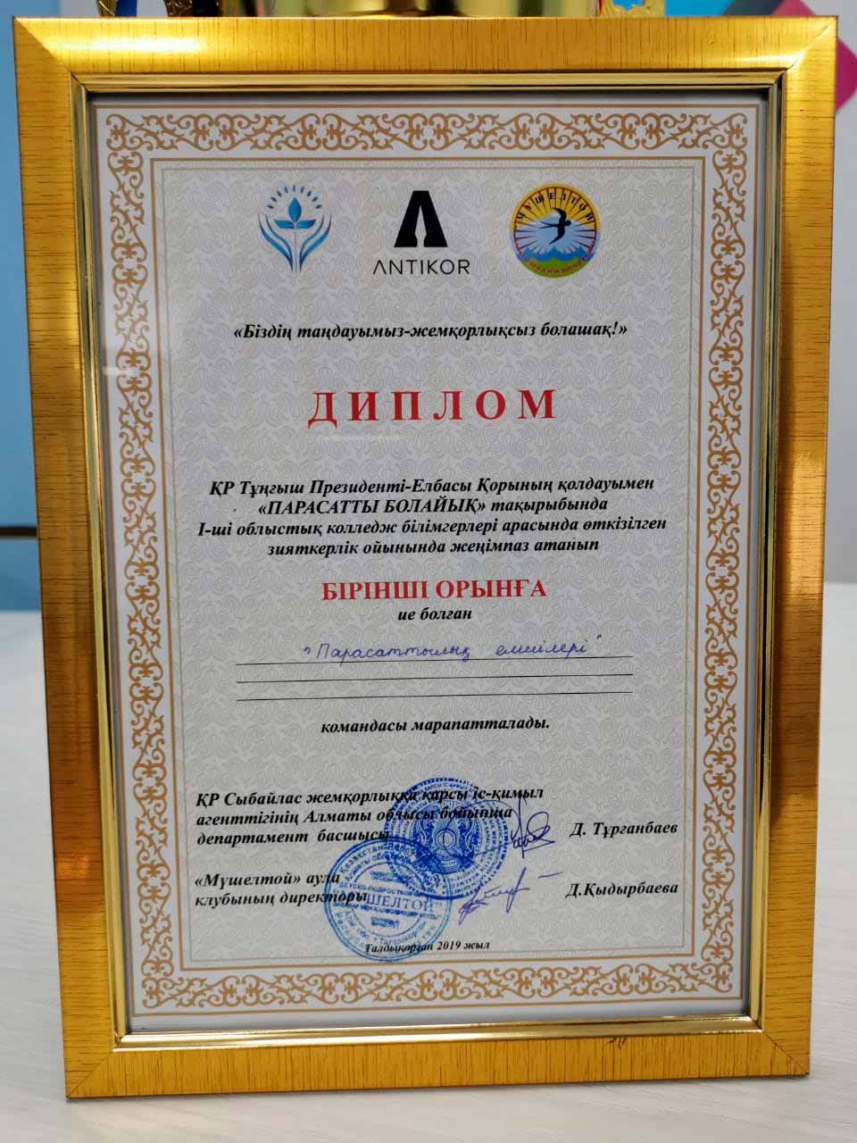 27.11.2021 года при поддержке фонда первого президента РК - лидера нации в 1 - ой областной интеллектуальной игре "Парасатты болайық" студенты колледжа заняли 1 - место. Поздравляем!